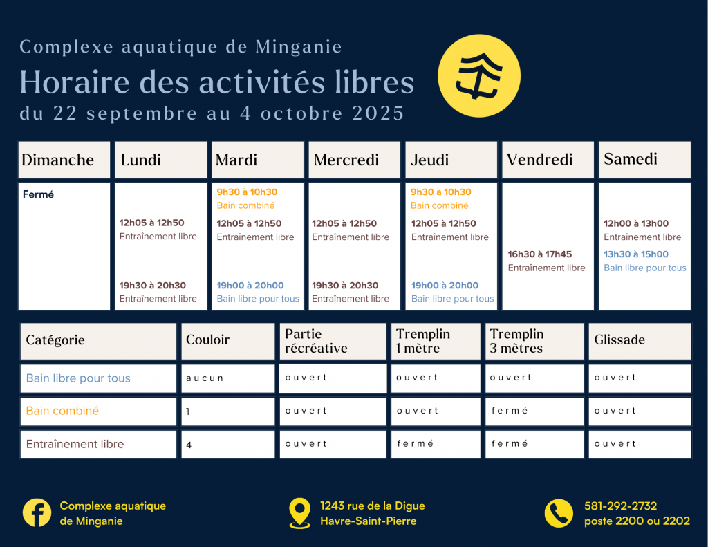 Horaire des activités libres du 22 septembre au 4 octobre 2025.