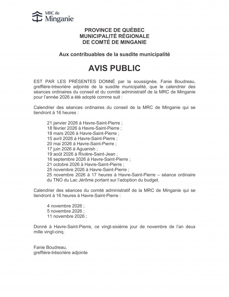 13 novembre 2023 – TNO du Lac Jérôme – Avis informatif sur l’adoption du budget 2023 et 2024