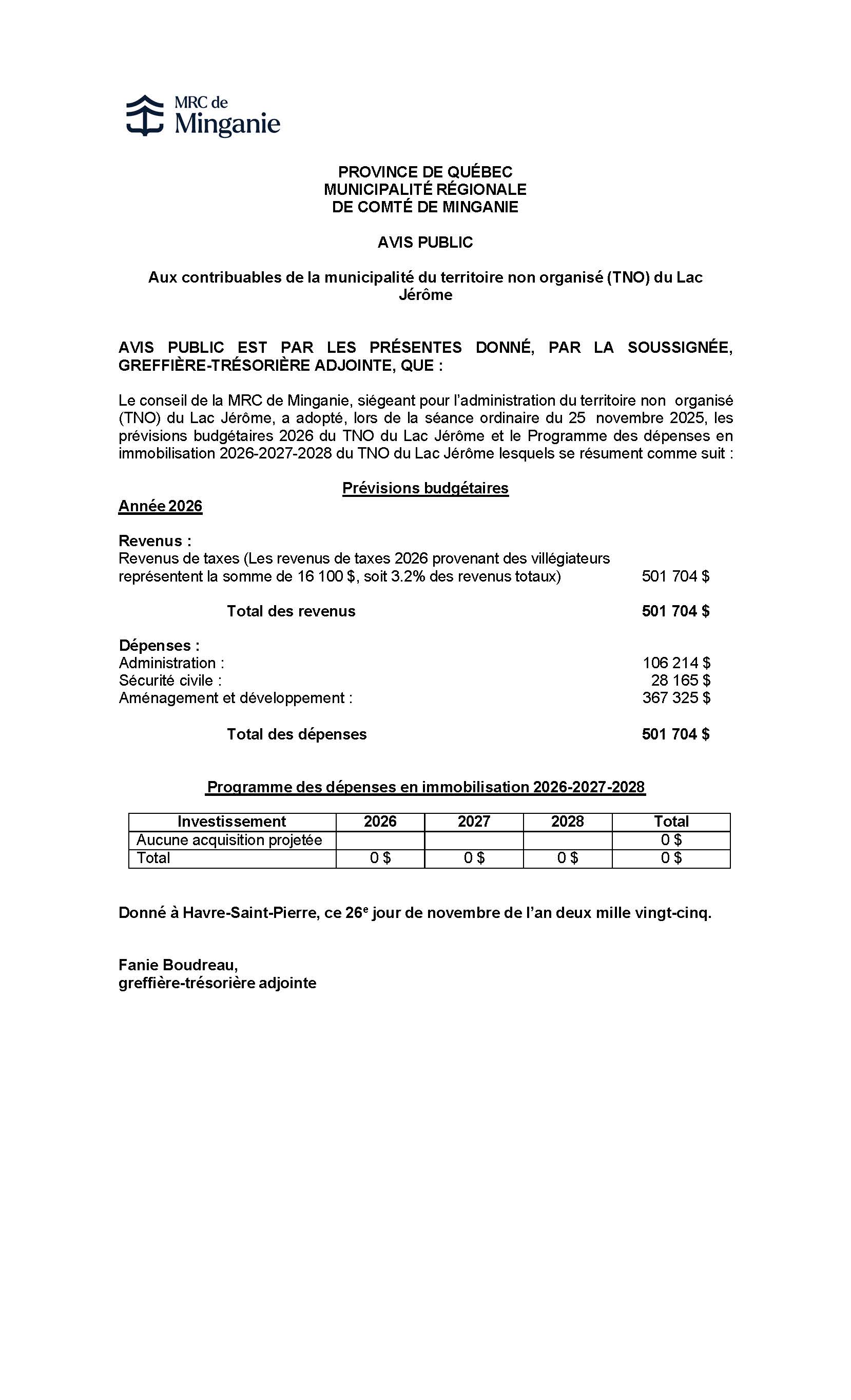 13 novembre 2023 – TNO du Lac Jérôme – Avis informatif sur l’adoption du budget 2023 et 2024